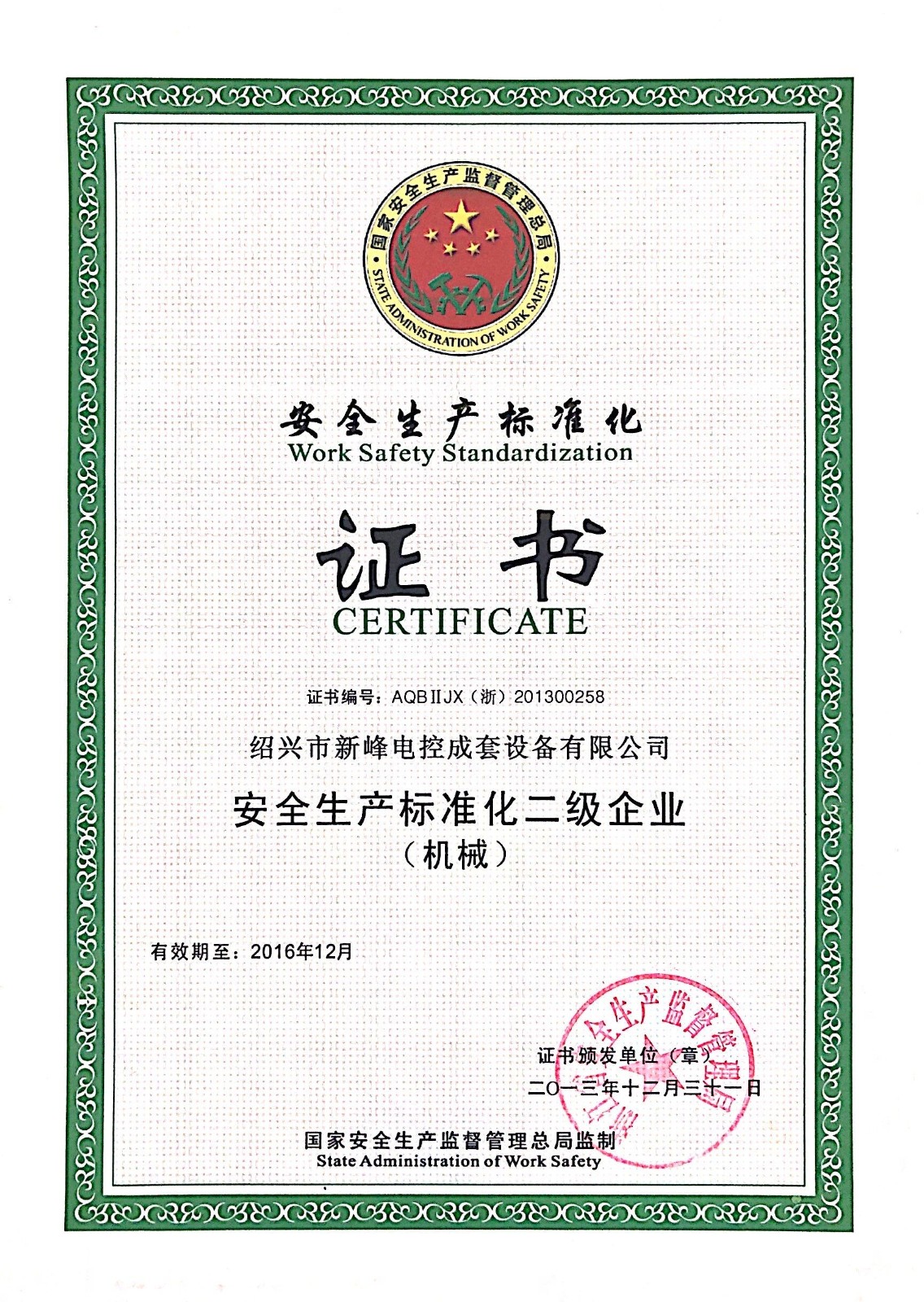 安全生產(chǎn)標準化二級-企業(yè)榮譽證書
