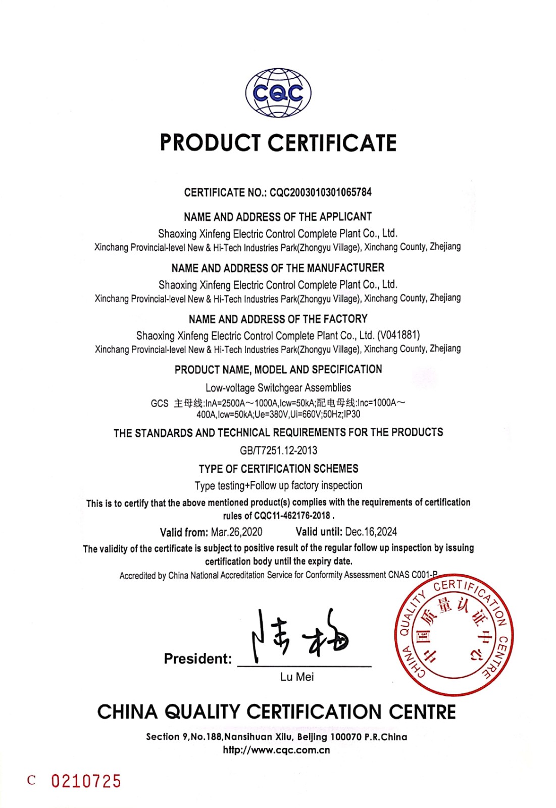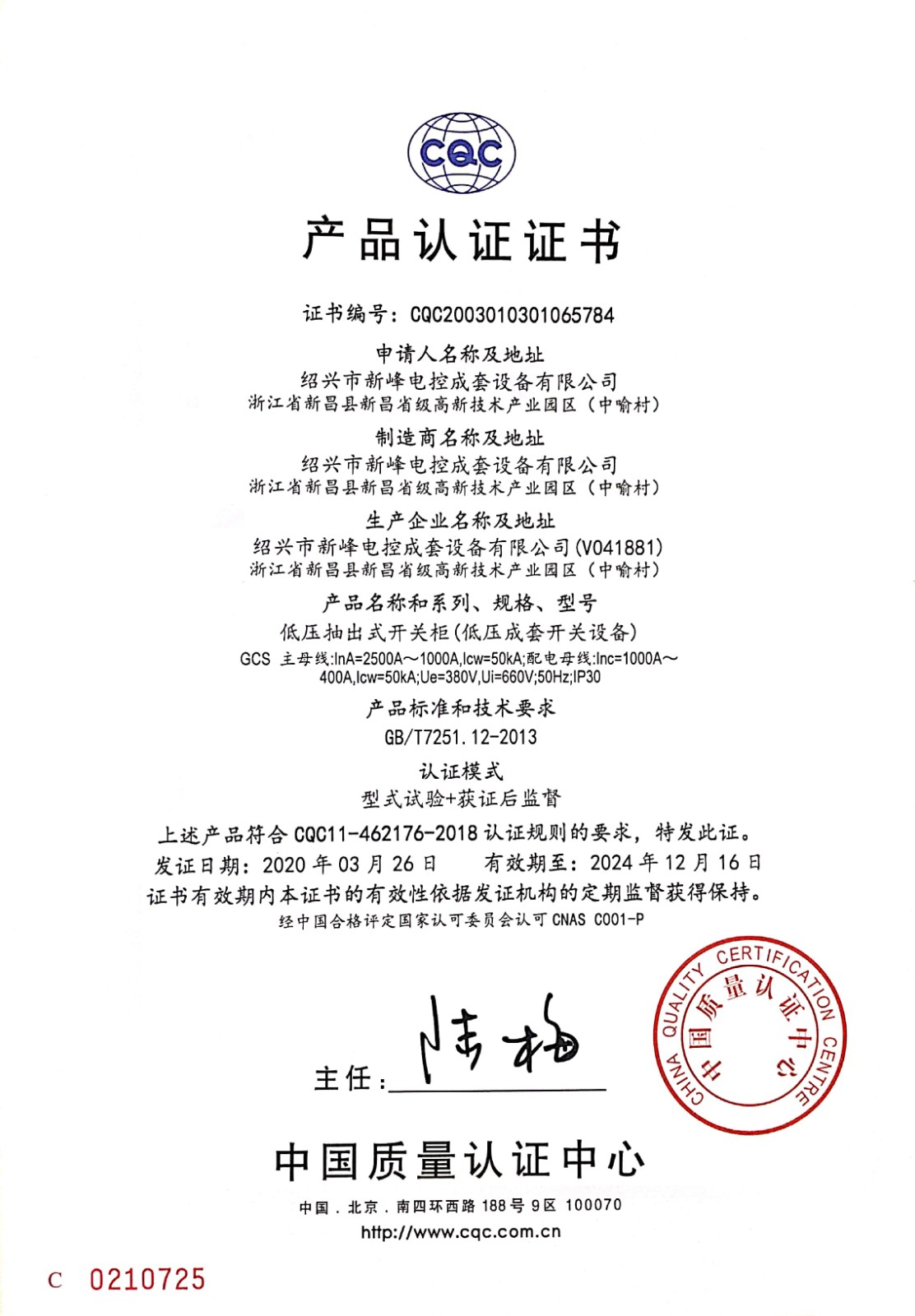 GCS--2500A-公司認(rèn)證證書